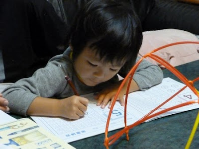 當練字本買來後,小幻雲就馬上學哥哥動起筆了