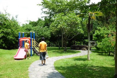 a) 步道、b)民宿及c)親子遊樂區充滿樹蔭的歩道,微風徐徐